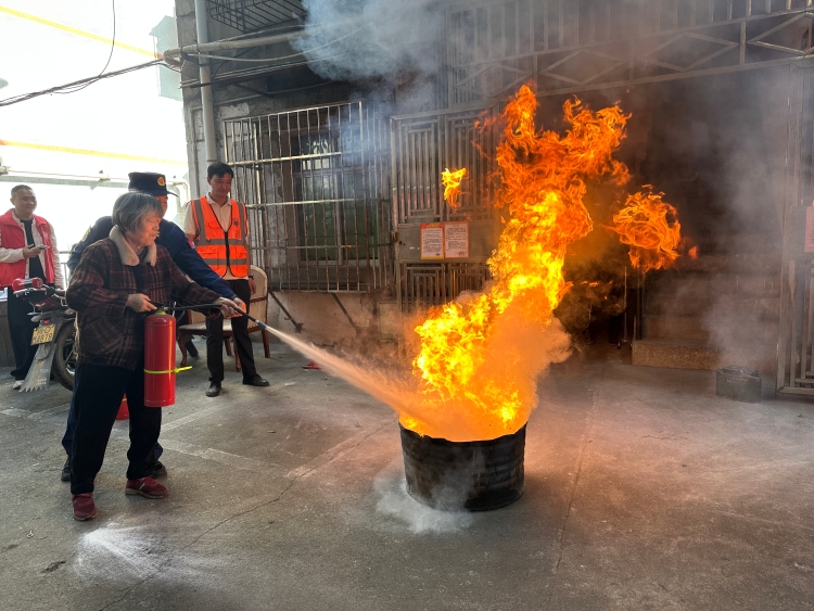 培训现场,大队宣传人员针对电动自行车违规充电、厨房用火离人、电器线路老化、楼道堆物堵占消防通道等问题,逐一讲解防范要点,明确“三清三关”核心要求。最后,消防员讲解并演示灭火器使用规范,设置实操体验环节,指导居民分组上手操作,亲手扑灭模拟火源,切实掌握灭火时的角度把控与距离掌握技巧。